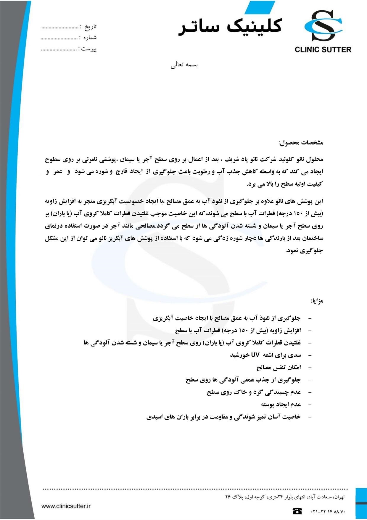 این محصول با استفاده از فناوری نانو پوششی فوق العاده نازک و نامریی بر روی سطوح ایجاد مینماید و همچنین در تمامی خلل و فرج های سطح نفوذ کرده و باعث ایجاد یک لایه حفاظتی کاملا ساختاری میگردد و اجازه نفوذ اثر آلودگی و شوره و یا سفیدک توسط باران و یا هرگونه رطوبت بر روی سطح اجرا شده را نمیدهد.